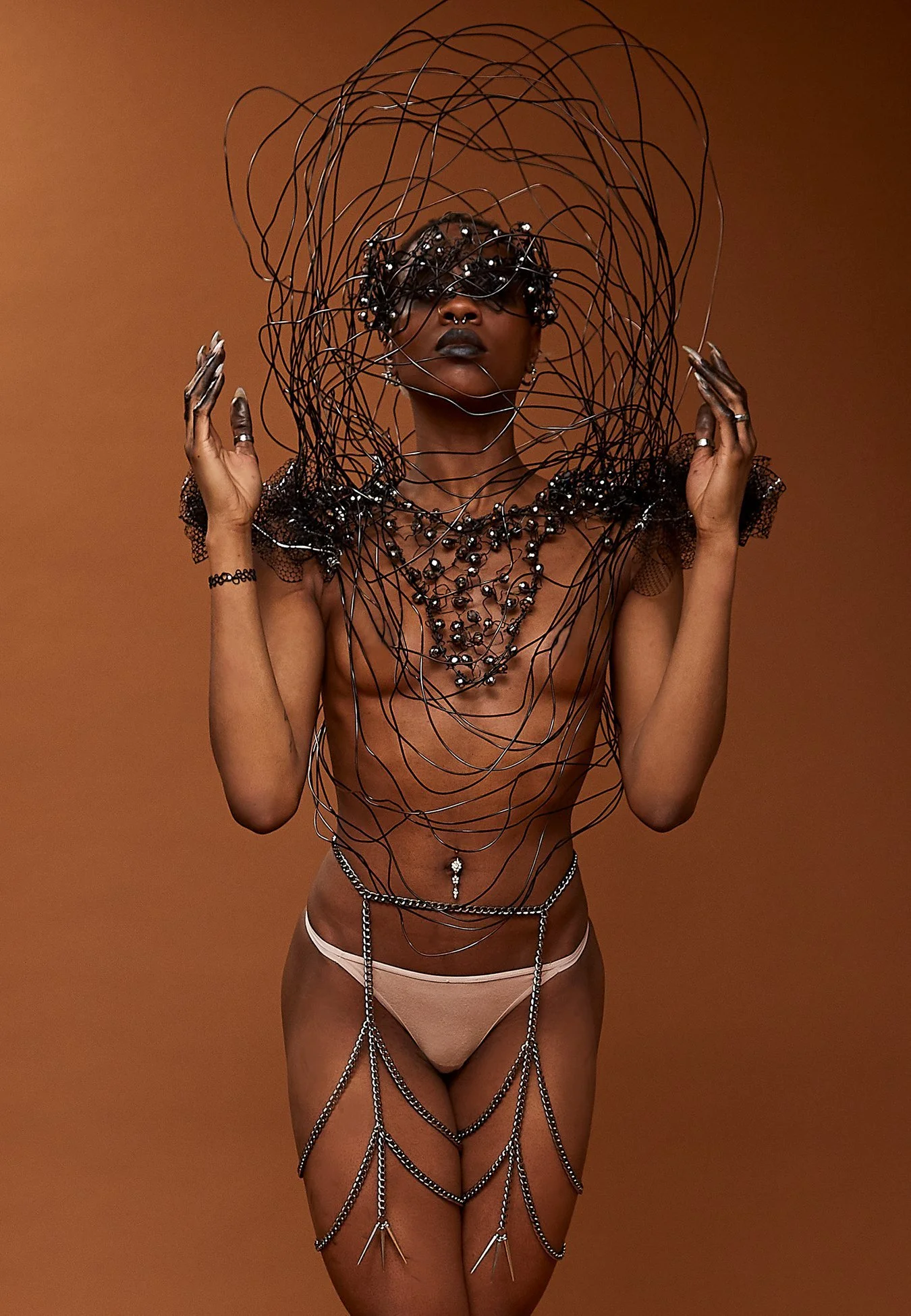 Within each of us, passions are rippling just beneath the surface. Secret infatuations motivate us, and delightful thrills push us to the edge. PLEASURE explores the desires that cause your heart to flutter, your mind to race, and your spirit to soar. Featuring avant garde wire sculptures, flowing fabrics and opulent accessories, this collection will transport you to a space where anything is accessible.