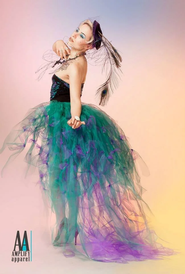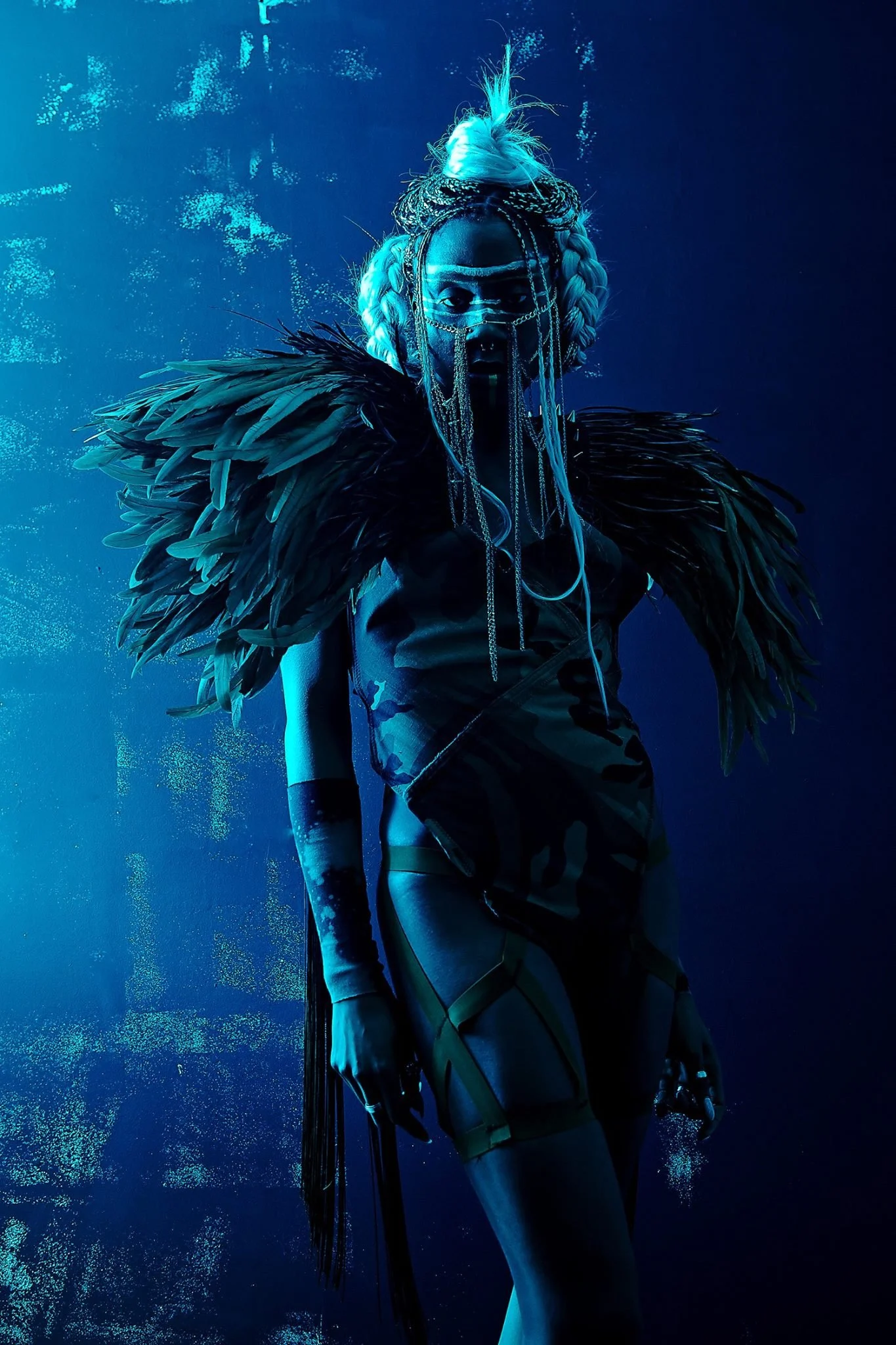 The gritty intensity of survival is captured in this collection through the use of distressed textiles, elaborate wearable sculptures, and a combination of feather and faux fur accessories. WASTELAND depicts a turbulent future, where hope is fleeting and desperation plagues the earth. Can humanity survive the apocalypse?